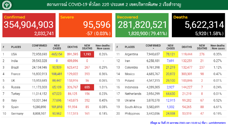 ขณะที่สถานการณ์ทั่วโลกพบผู้ป่วยเพิ่ม 2,032,741 ราย รวม 354,904,903 ราย อาการหนัก 95,596 ราย หายป่วย 281,820,521 ราย เสียชีวิต 5,622,314 ราย โดยสหรัฐอเมริกาพบผู้ป่วยเพิ่ม 465,154 ราย รวม 79,958,690 ราย เสียชีวิตเพิ่ม 1,193 ราย รวม 891,595 ราย อินเดีย ไม่มีรายงานตัวเลข บราซิล พบเพิ่ม 90,509 ราย รวม 24,134,946 ราย เสียชีวิตเพิ่ม 267 ราย รวม 623,412 ราย ส่วนไทยอยู่ในอันดับที่ 26 ของโลก