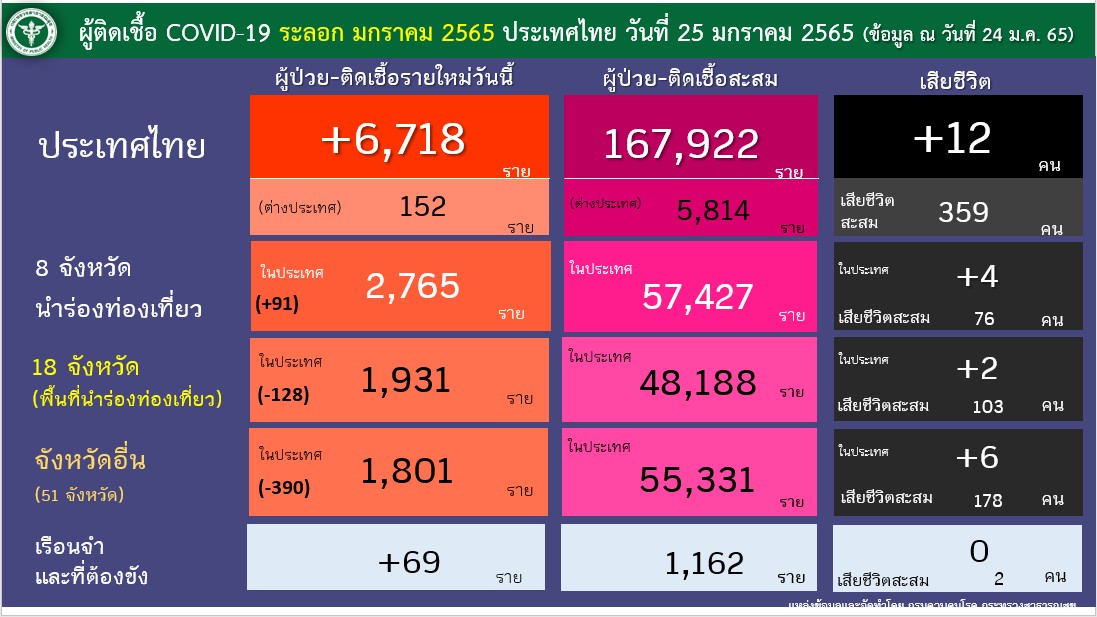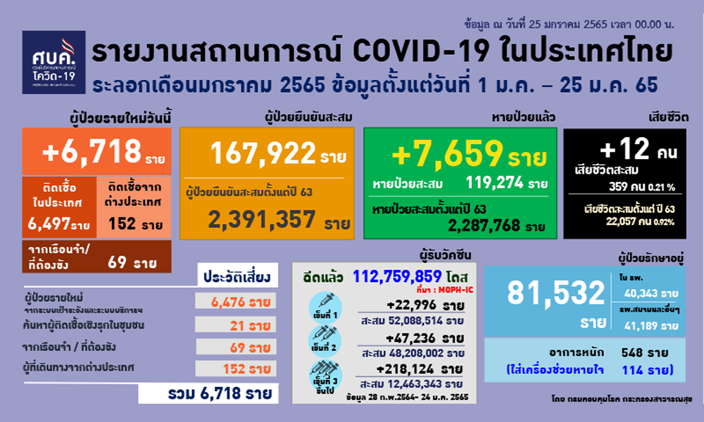 สำนักข่าวอิศรา (www.isranews.org) รายงานว่า เมื่อวันที่ 25 ม.ค. 2565 ศูนย์บริหารสถานการณ์โควิด (ศบค.) รายงานสถานการณ์ประจำวัน โดยพบผู้ป่วยรายใหม่ 6,718 ราย จำแนกเป็น ติดเชื้อในประเทศ 6,497 ราย เกิดจากระบบเฝ้าระวังและระบบบริการฯ 6,476 ราย เกิดจากการค้นหาเชิงรุกและพบการติดเชื้อในชุมชน 21 ราย ติดเชื้อภายในเรือนจำ 69 ราย อีก 152 รายเดินทางกลับมาจากต่างประเทศ รวมผู้ป่วยสะสม 2,391,357 ราย