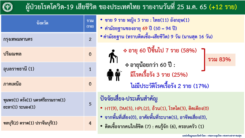 เสียชีวิตเพิ่ม 12 ราย เป็นผู้สูงอายุ 7 ราย คิดเป็น 58% และมีโรคเรื้อรัง 3 ราย คิดเป็น 25% รวมเสียชีวิตสะสม 22,057 ราย ในจำนวนนี้ มาจาก กทม. 2 ราย อุบลราชธานี 1 ราย ชุมพร 1 ราย ตรัง 1 ราย นครศรีธรรมราช 1 ราย ยะลา 1 ราย ระนอง 1 ราย ชลบุรี 2 ราย ตราด 1 ราย และปราจีนบุรี 1 ราย