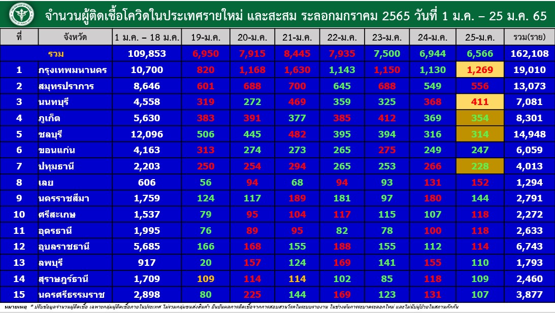 อนึ่ง เมื่อเวลา 08.00 น. สำนักข่าวอิศรา รายงานว่า เมื่อวันที่ 25 ม.ค.2565 สถานการณ์โควิดประจำวัน พบผู้ป่วยรายใหม่ 6,718 ราย จำแนกเป็นผู้ป่วยจากในประเทศ 6,566 ราย และผู้ป่วยมาจากต่างประเทศ 152 ราย รวมป่วยสะสมตั้งแต่ 1 ม.ค. 167,922 ราย