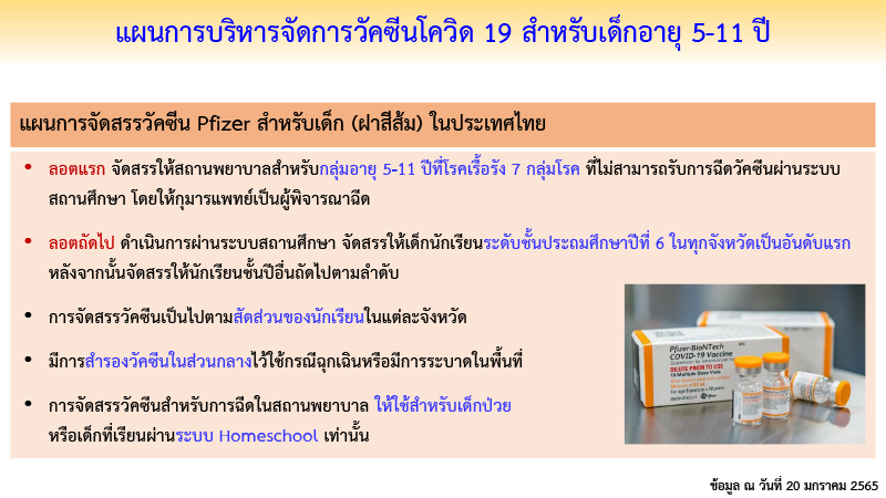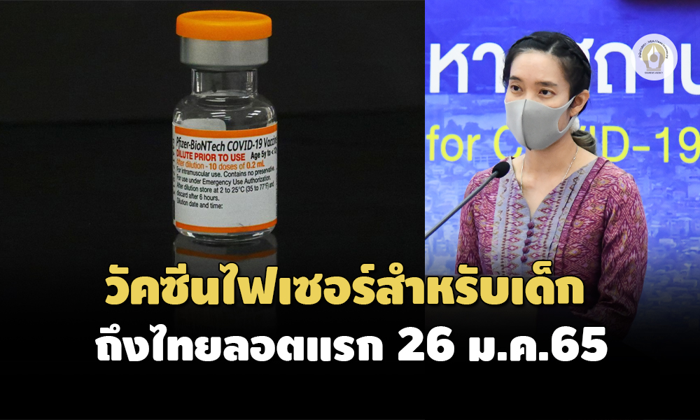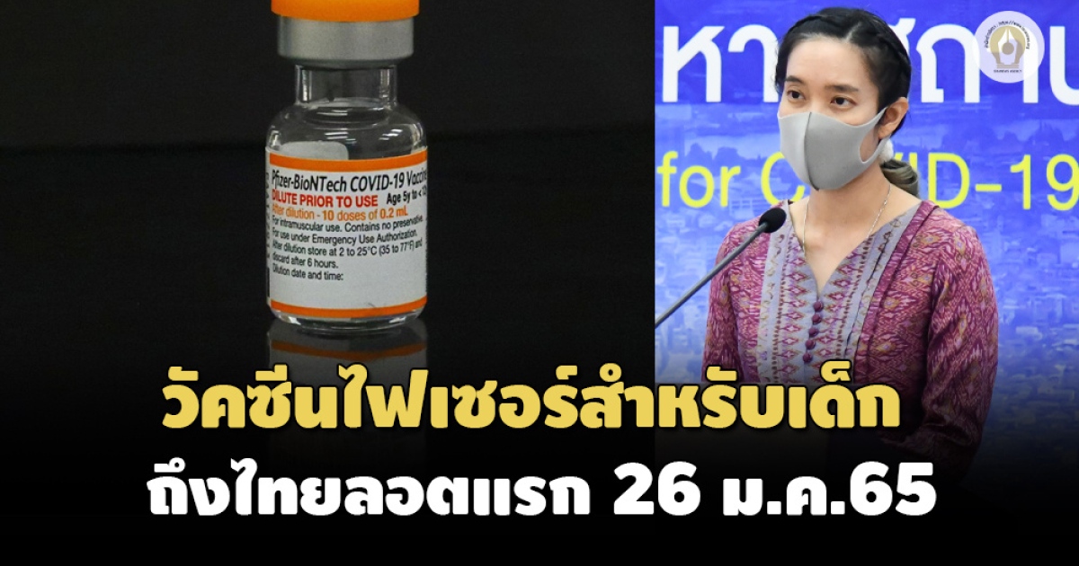 ศบค.เผย วัคซีนไฟเซอร์สำหรับเด็ก 5-11 ปี จะถึงไทยลอตแรก 26 ม.ค. พร้อมจัดสรรให้เด็กกลุ่มโรคเรื้อรังก่อน จากนั้นจะฉีดให้เด็ก ป.6 ก่อนลำหลั่นตามลำดับไป