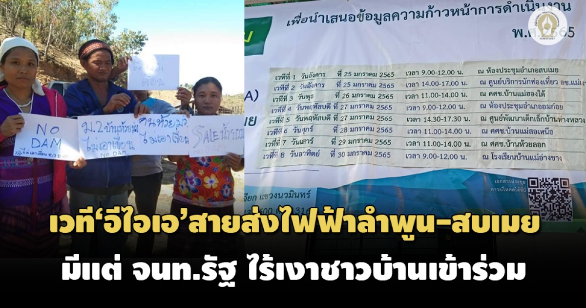 กฟผ.เดินสายจัดเวทีอีไอเอฟังความเห็นโครงการสายส่งไฟฟ้าลำพูน-สบเมย มีแต่ จนท.รัฐ ไร้เงาชาวบ้าน หวั่นถูกอ้างผ่านความเห็นประชาชน เผยรายละเอียดโครงการ ผ่าป่าสมบูรณ์ 6 แห่ง นักอนุรักษ์ชี้รองรับโครงการยักษ์ผันน้ำยวม