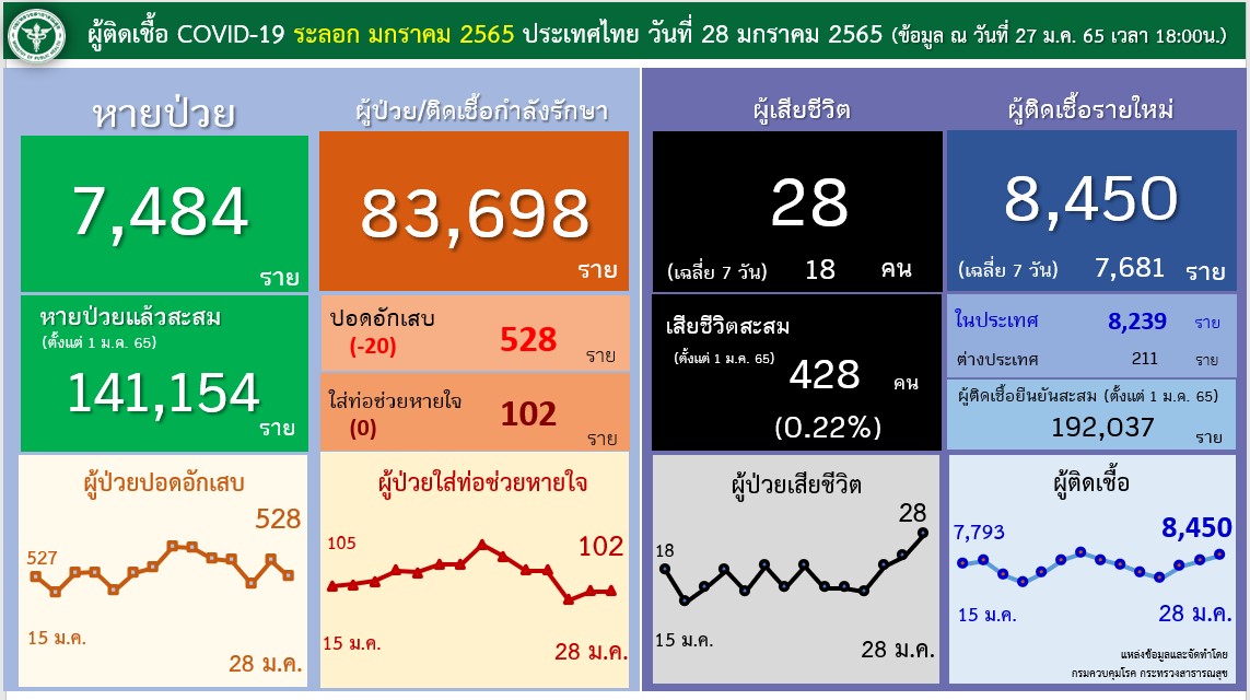 ป่วยโควิดเพิ่ม 8,450 ราย อาการหนัก 528 ราย สะสม 2.41 ล้านราย ตาย 28 ราย เป็นผู้ที่ไม่เคยฉีดวัคซีนถึง 15 ราย ส่วนนักท่องเที่ยวเข้าไทย ติดเชื้อใหม่ 211 ราย