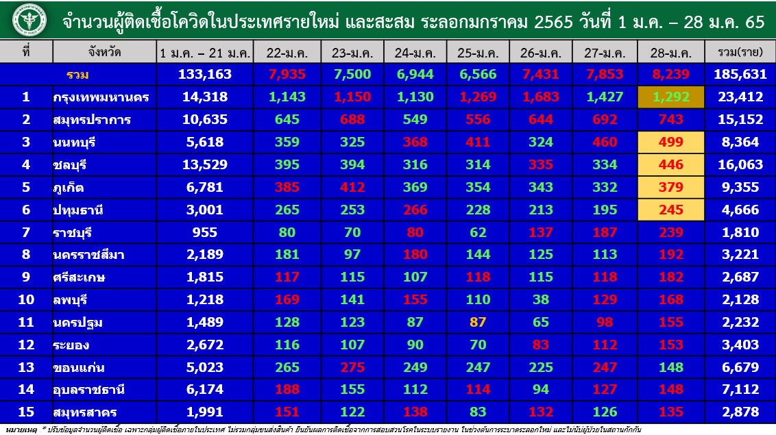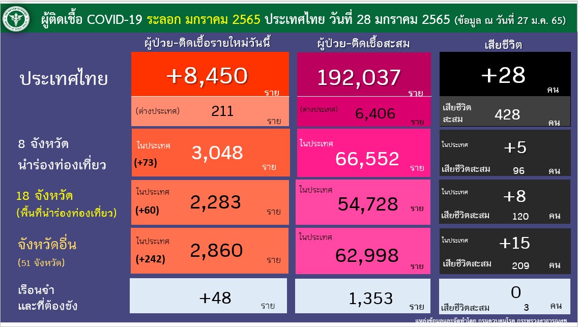 อนึ่งเมื่อเวลาประมาณ 08.00 น. สำนักข่าวอิศรา รายงานว่า เมื่อวันที่ 28 ม.ค. 2565 พบผู้ป่วยรายใหม่ 8,450 ราย จำแนกเป็น ติดเชื้อในประเทศ 8,239 ราย ในเรือนจำ 48 ราย อีก 211 รายเดินทางกลับมาจากต่างประเทศ ทำให้มีผู้ป่วยสะสมระลอก ม.ค. 192,037 ราย