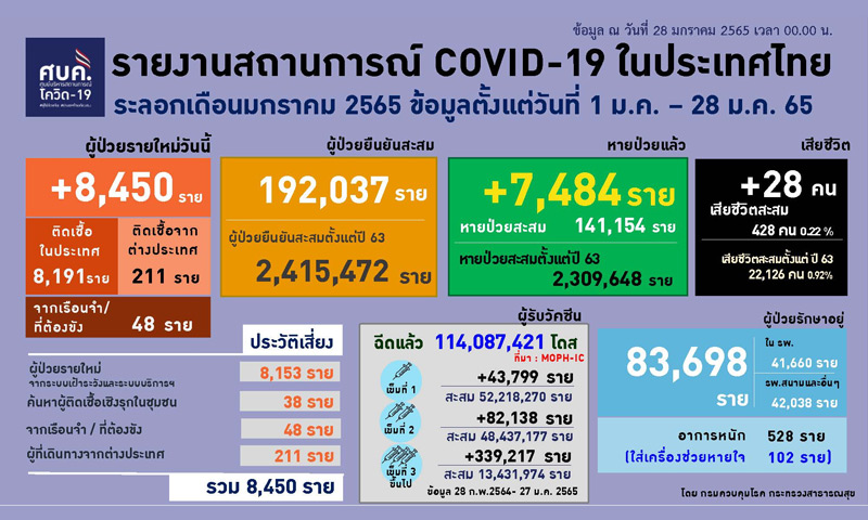 สำนักข่าวอิศรา (www.isranews.org) รายงานว่า เมื่อวันที่ 22 ม.ค. 2565 พญ.อภิสมัย ศรีรังสรรค์ ผู้ช่วยโฆษกศูนย์บริหารสถาการณ์โควิด-19 (ศบค.) รายงานสถานการณ์ประจำวัน โดยพบผู้ป่วยรายใหม่ 8,450 ราย จำแนกเป็น ติดเชื้อในประเทศ 8,191 ราย เกิดจากระบบเฝ้าระวังและระบบบริการฯ 8,153 ราย เกิดจากการค้นหาเชิงรุกและพบการติดเชื้อในชุมชน 38 ราย ติดเชื้อภายในเรือนจำ 48 ราย อีก 211 รายเดินทางกลับมาจากต่างประเทศ รวมผู้ป่วยสะสม 2,415,472 ราย