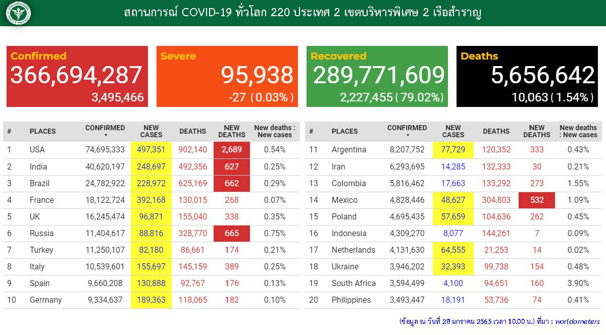 ขณะที่สถานการณ์ทั่วโลกพบผู้ป่วยเพิ่ม 3,495,466 ราย รวม 366,694,267 ราย อาการหนัก 95,938 ราย หายป่วย 289,771,609 ราย เสียชีวิต 5,656,642 ราย โดยสหรัฐอเมริกาพบผู้ป่วยเพิ่ม 497,351 ราย รวม 74,695,333 ราย เสียชีวิตเพิ่ม 2,689 ราย รวม 902,140 ราย อินเดีย พบเพิ่ม 248,697 ราย รวม 40,620,197 ราย เสียชีวิตเพิ่ม 627 ราย รวม 492,356 ราย บราซิล พบเพิ่ม 228,972 ราย รวม 24,782,922 ราย เสียชีวิตเพิ่ม 662 ราย รวม 625,169 ราย ส่วนไทยอยู่ในอันดับที่ 29 ของโลก