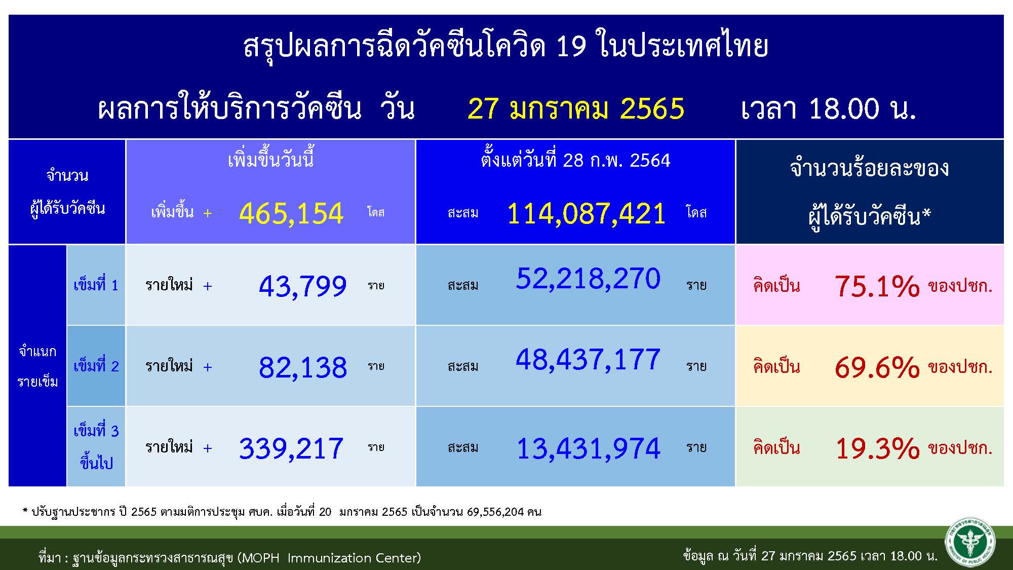 ขณะที่ การกระจายวัคซีนในประเทศ เมื่อวันที่ พบผู้ที่ได้รับผู้ที่ได้รับวัคซีนเข็มที่ 1 เพิ่มเติม จำนวน 43,799 ราย ผู้ได้รับเข็มที่ 2 จำนวน 82,138 ราย และผู้ได้รับเข็มที่ 3 จำนวน 339,217 ราย รวมสะสมผู้ได้รับวัคซีนแล้ว 114,087,421 ราย แบ่งเป็น ผู้ได้รับเข็มที่ 1 จำนวน 52,218,270 ราย คิดเป็น 75.1% ผู้ได้รับเข็มที่ 2 จำนวน 48,437,177 ราย คิดเป็น 69.6% และผู้ได้รับเข็มที่ 3 จำนวน 13,431,974 ราย คิดเป็น 19.3%