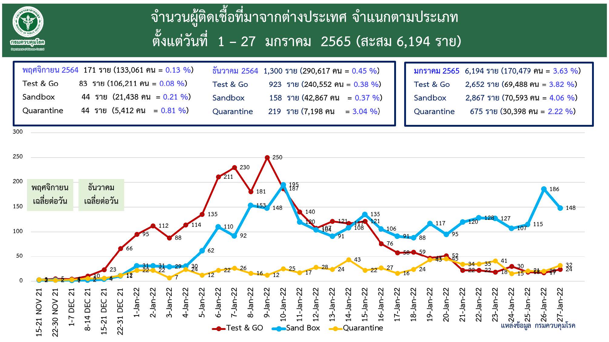ทำให้ผู้ติดเชื้อจากต่างประเทศ เดือน ม.ค. สะสมรวม 6,194 ราย จำแนกเป็น แบบไม่ต้องกักตัว (Test and Go) 2,652 ราย แบบแซนด์บ็อกซ์ (Sandbox) 2,867 ราย แบบกักตัว (Quarantine) 675 ราย