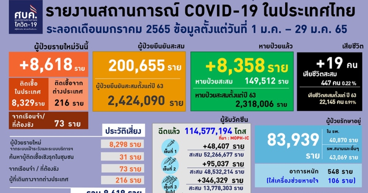 สำนักข่าวอิศรา (www.isranews.org) รายงานว่า เมื่อวันที่ 29 ม.ค. 2565 ศูนย์บริหารสถานการณ์โควิด (ศบค.) รายงานสถานการณ์ประจำวัน โดยพบผู้ป่วยรายใหม่ 8,618 ราย จำแนกเป็น ติดเชื้อในประเทศ 8,329 ราย เกิดจากระบบเฝ้าระวังและระบบบริการฯ 8,298 ราย เกิดจากการค้นหาเชิงรุกและพบการติดเชื้อในชุมชน 31 ราย ติดเชื้อภายในเรือนจำ 73 ราย อีก 216 รายเดินทางกลับมาจากต่างประเทศ รวมผู้ป่วยสะสม 2,424,090 ราย