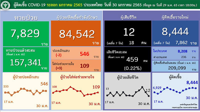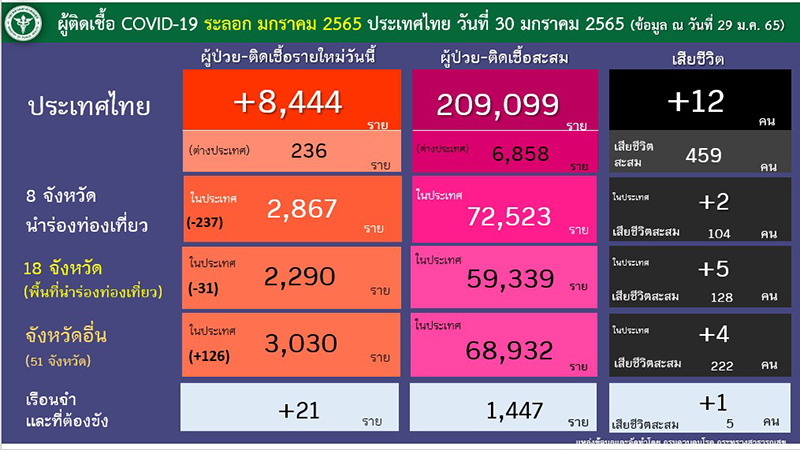 สำนักข่าวอิศรา (www.isranews.org) รายงานว่า เมื่อวันที่ 30 ม.ค. 2565 ศูนย์บริหารสถานการณ์โควิด (ศบค.) รายงานสถานการณ์ประจำวัน โดยพบผู้ป่วยรายใหม่ 8,444 ราย จำแนกเป็น ติดเชื้อในประเทศ 8,187 ราย เกิดจากระบบเฝ้าระวังและระบบบริการฯ 8,133 ราย เกิดจากการค้นหาเชิงรุกและพบการติดเชื้อในชุมชน 54 ราย ติดเชื้อภายในเรือนจำ 21 ราย อีก 236 รายเดินทางกลับมาจากต่างประเทศ รวมผู้ป่วยสะสม 2,432,534 ราย