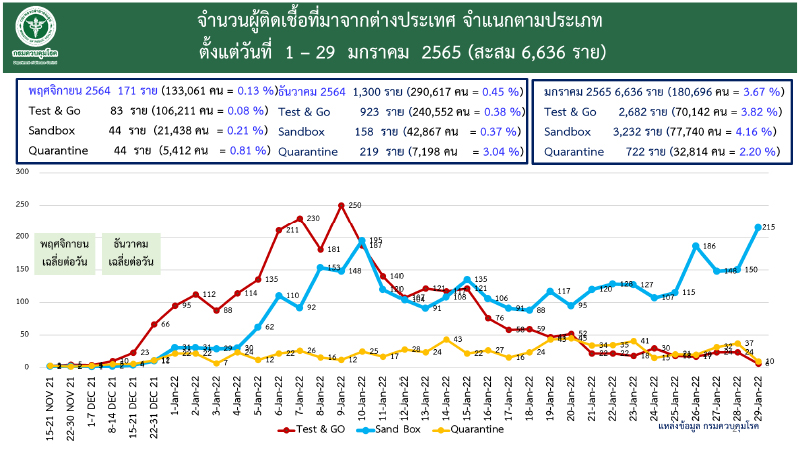 ทำให้ผู้ติดเชื้อจากต่างประเทศ เดือน ม.ค. สะสมรวม 6,636 ราย จำแนกเป็น แบบไม่ต้องกักตัว (Test and Go) 2,682 ราย แบบแซนด์บ็อกซ์ (Sandbox) 3,232 ราย แบบกักตัว (Quarantine) 722 ราย