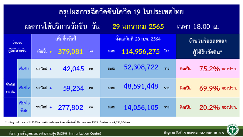 ขณะที่ การกระจายวัคซีนในประเทศ พบผู้ที่ได้รับผู้ที่ได้รับวัคซีนเข็มที่ 1 เพิ่มเติม จำนวน 42,045 ราย ผู้ได้รับเข็มที่ 2 จำนวน 59,234 ราย และผู้ได้รับเข็มที่ 3 จำนวน 277,802 ราย รวมสะสมผู้ได้รับวัคซีนแล้ว 114,956,275 ราย แบ่งเป็น ผู้ได้รับเข็มที่ 1 จำนวน 52,308,722 ราย คิดเป็น 75.2% ผู้ได้รับเข็มที่ 2 จำนวน 48,591,448 ราย คิดเป็น 69.9% และผู้ได้รับเข็มที่ 3 จำนวน 14,056,105 ราย คิดเป็น 20.2%