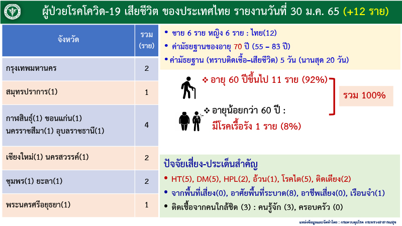 สำหรับผู้เสียชีวิต 12 ราย โดยในจำนวนนี้ มาจาก กทม. 2 ราย สมุทรปราการ 1 ราย กาฬสินธุ์ 1 ราย ขอนแก่น 1 ราย นครราชสีมา 1 ราย อุบลราชธานี 1 ราย เชียงใหม่ 1 ราย นครสวรรค์ 1 ราย ชุมพร 1 ราย ยะลา 1 ราย และพระนครศรีอยุธยา 1 ราย มีปัจจัยเสี่ยงการติดเชื้อมาจากคนใกล้ชิด คนรู้จัก อาศัยในพื้นที่ระบาด และเรือนจำ