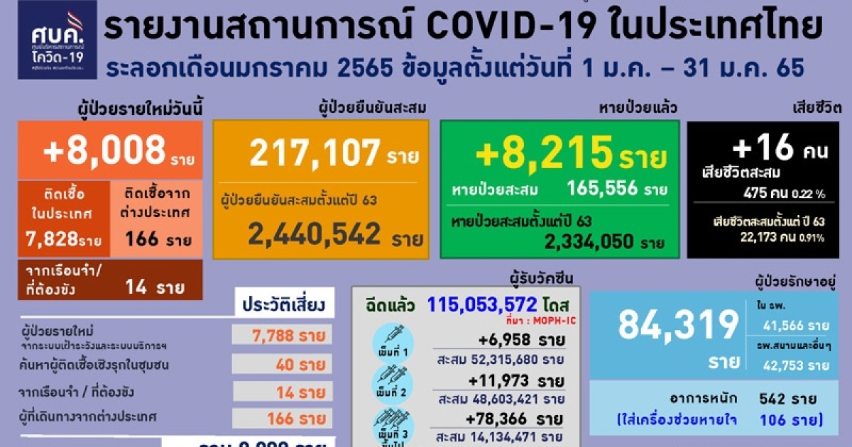 สำนักข่าวอิศรา (www.isranews.org) รายงานว่า เมื่อวันที่ 31 ม.ค. 2565 นพ.ทวีศิลป์ วิษณุโยธิน โฆษกศูนย์บริหารสถาการณ์โควิด-19 (ศบค.) รายงานสถานการณ์ประจำวัน โดยพบผู้ป่วยรายใหม่ 8,008 ราย จำแนกเป็น ติดเชื้อในประเทศ 7,828 ราย เกิดจากระบบเฝ้าระวังและระบบบริการฯ 7,788 ราย เกิดจากการค้นหาเชิงรุกและพบการติดเชื้อในชุมชน 40 ราย ติดเชื้อภายในเรือนจำ 14 ราย อีก 166 รายเดินทางกลับมาจากต่างประเทศ รวมผู้ป่วยสะสม 2,440,542 ราย