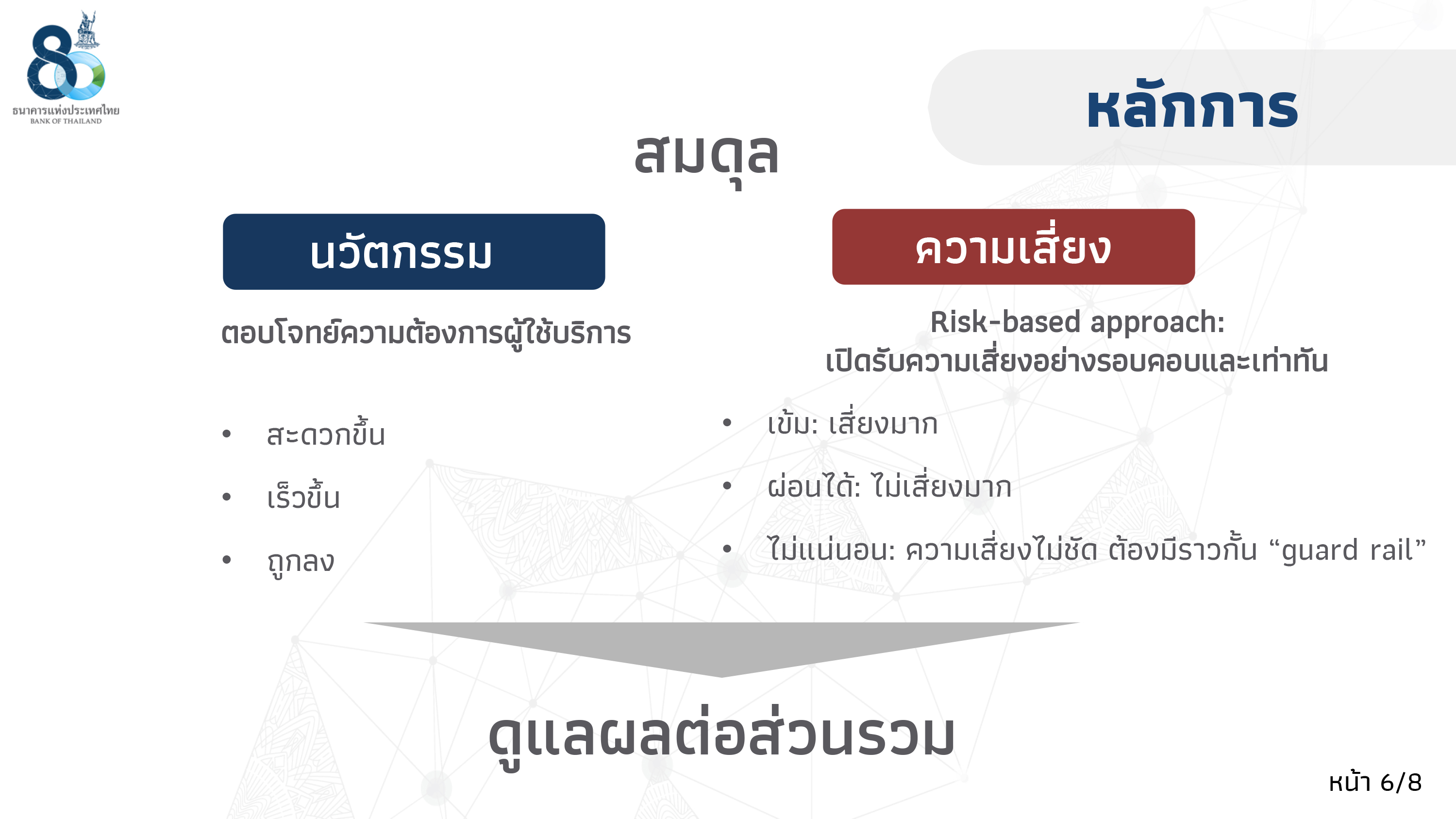 3.การกำกับดูแลอย่างยืดหยุ่นและเท่าทันความเสี่ยงรูปแบบใหม่ โดยคำนึงถึงสมดุลระหว่างบทบาทของ ธปท. ในการส่งเสริมนวัตกรรมและการกำกับดูแลความเสี่ยงที่จะส่งผลกระทบต่อเสถียรภาพระบบเศรษฐกิจการเงิน ผ่าน (1) การกำกับดูแลผู้ให้บริการตามลักษณะความเสี่ยงและความซับซ้อนของบริการทางการเงิน