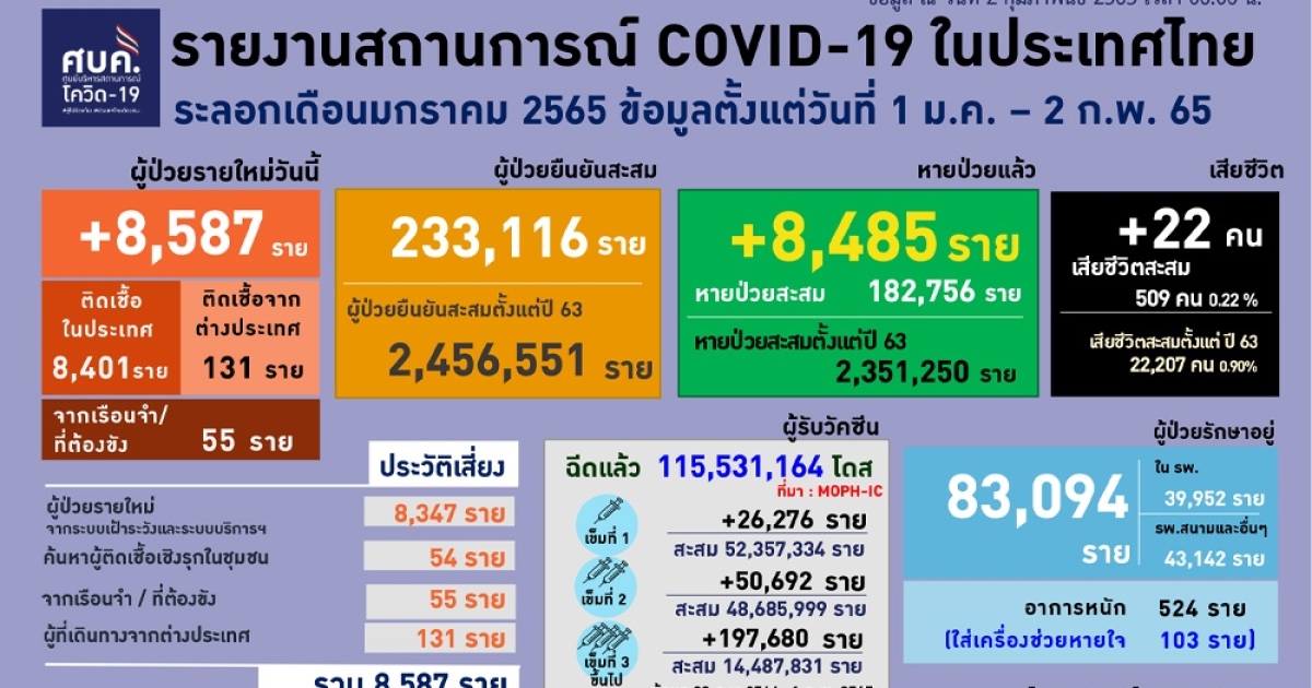 สำนักข่าวอิศรา (www.isranews.org) รายงานว่า เมื่อวันที่ 2 ก.พ. 2565 ศูนย์บริหารสถานการณ์โควิด (ศบค.) รายงานสถานการณ์ประจำวัน โดยพบผู้ป่วยรายใหม่ 8,587 ราย จำแนกเป็น ติดเชื้อในประเทศ 8,401 ราย เกิดจากระบบเฝ้าระวังและระบบบริการฯ 8,347 ราย เกิดจากการค้นหาเชิงรุกและพบการติดเชื้อในชุมชน 54 ราย ติดเชื้อภายในเรือนจำ 55 ราย อีก 131 รายเดินทางกลับมาจากต่างประเทศ รวมผู้ป่วยสะสม 2,456,551 ราย