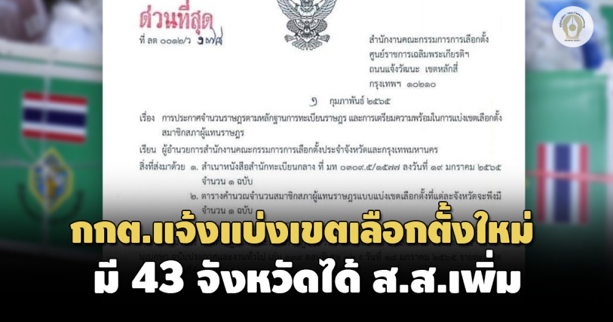 กกต.แจ้งทุกจังหวัดแบ่งเขตเลือกตั้งใหม่ มี 43 จังหวัดได้ ส.ส.เพิ่มขึ้น เฉพาะ กทม.เพิ่มเป็น 33 คน จากการเลือกตั้งครั้งก่อนมี 30 คน