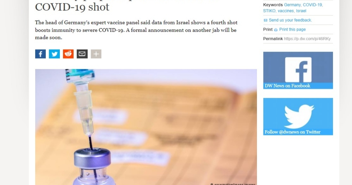 สำนักข่าวอิศรา (www.isranews.org) รายงานว่าสถานการณ์โควิด-19 ว่าที่ประเทศเยอรมนี นพ.การโทมัส เมอร์เทนส์ หัวหน้าคณะกรรมการผู้เชี่ยวชาญวัคซีนหรือ STIKO ได้เปิดเผยว่าคณะกรรมการเตรียมที่จะออกคำแนะนำว่จะมีการฉีดวัคซีนป้องกันไวรัสโควิด-19 ในโดสที่ 4 หรือไม่