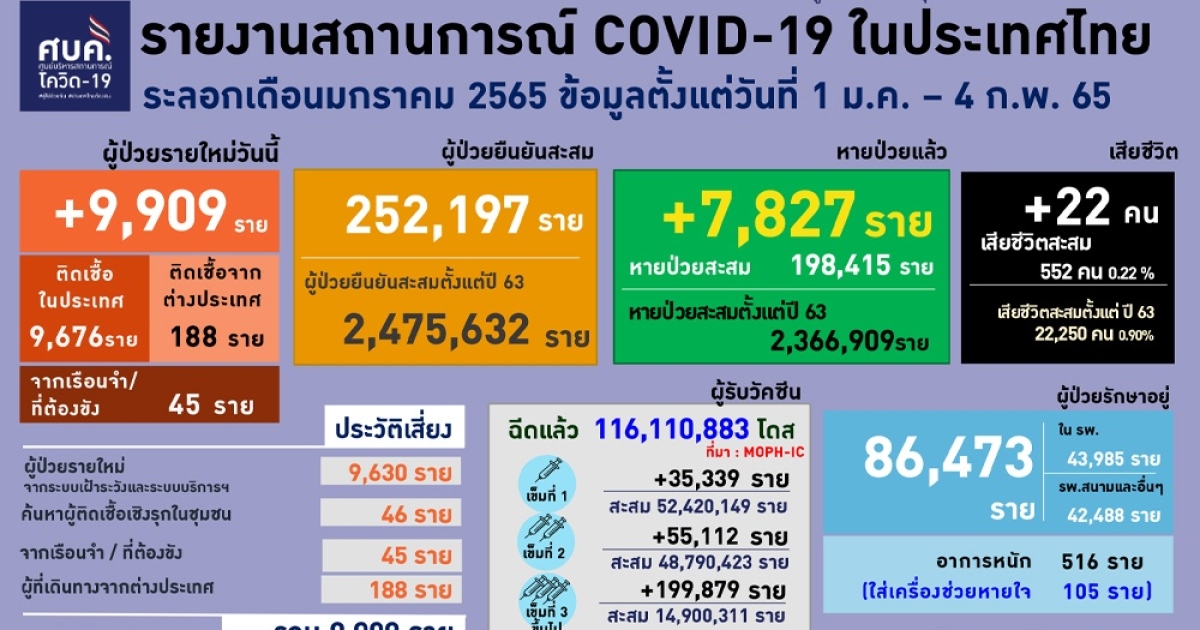 สำนักข่าวอิศรา (www.isranews.org) รายงานว่า เมื่อวันที่ 4 ก.พ. 2565 ศูนย์บริหารสถานการณ์โควิด (ศบค.) รายงานสถานการณ์ประจำวัน โดยพบผู้ป่วยรายใหม่ 9,909 ราย จำแนกเป็น ติดเชื้อในประเทศ 9,676 ราย เกิดจากระบบเฝ้าระวังและระบบบริการฯ 9,630 ราย เกิดจากการค้นหาเชิงรุกและพบการติดเชื้อในชุมชน 46 ราย ติดเชื้อภายในเรือนจำ 45 ราย อีก 188 รายเดินทางกลับมาจากต่างประเทศ รวมผู้ป่วยสะสม 2,475,632 ราย