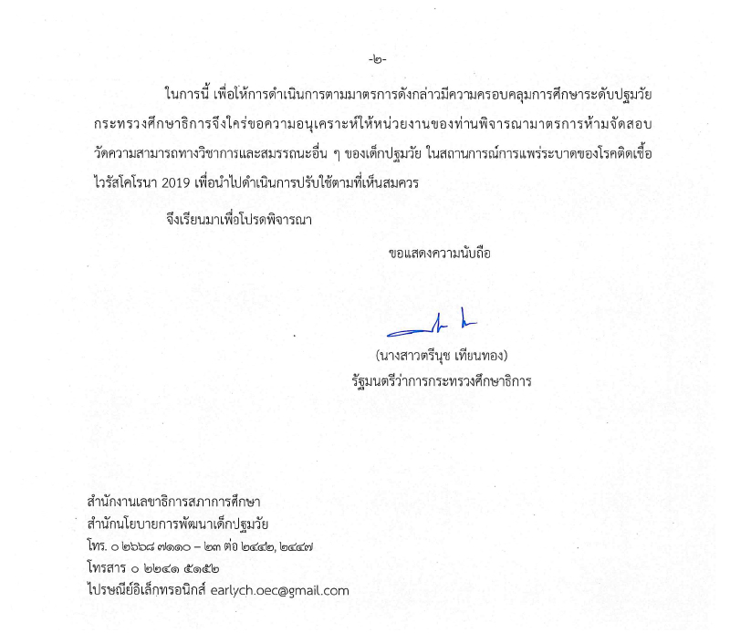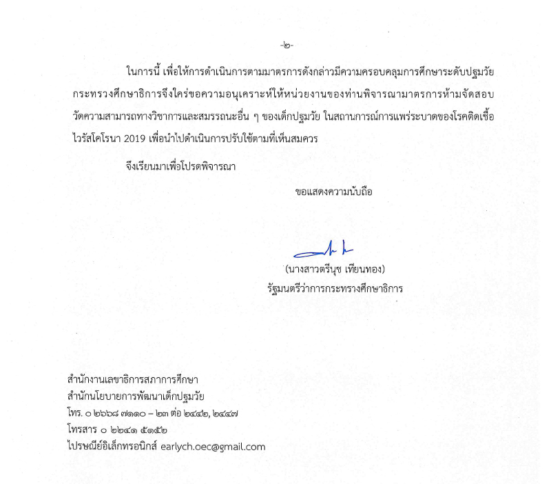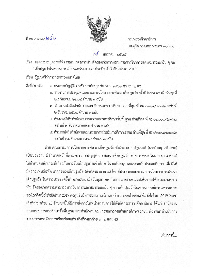 ในการนี้ เพื่อให้การดำเนินการตามมาตรการดังกล่าวมีความครอบคลุมการศึกษาระดับปฐมวัย กระทรวงศึกษาธิการจึงใคร่ขอความอนุเคราะห์ให้หน่วยงานพิจารณามาตรการห้ามจัดสอบวัดความสามารถทางวิชาการและสมรรถนะอื่นๆ ของเด็กปฐมวัย ในสถานการณ์การแพร่ระบาดของโควิด เพื่อให้ดำเนินการปรับใช้ตามที่เห็นสมควร