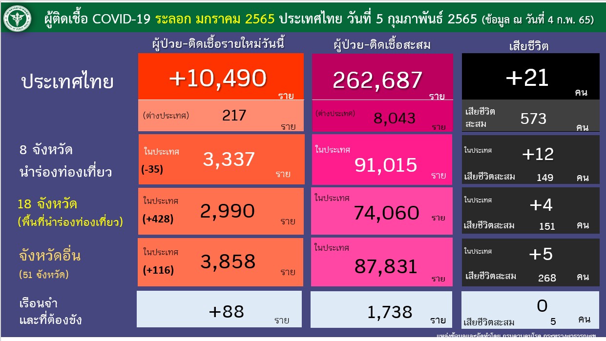 สำนักข่าวอิศรา (www.isranews.org) รายงานว่าเมื่อวันที่ 5 ก.พ. 2565 ศูนย์บริหารสถาการณ์โควิด-19 (ศบค.) รายงานสถานการณ์ประจำวัน โดยพบผู้ป่วยรายใหม่ 10,490 ราย จำแนกเป็น ติดเชื้อในประเทศ 20,273 ราย เกิดจากระบบเฝ้าระวังและระบบบริการฯ 10,152 ราย เกิดจากการค้นหาเชิงรุกและพบการติดเชื้อในชุมชน 33 ราย ติดเชื้อภายในเรือนจำ 88 ราย อีก 217 รายเดินทางกลับมาจากต่างประเทศ รวมผู้ป่วยสะสม 2,486,122 ราย