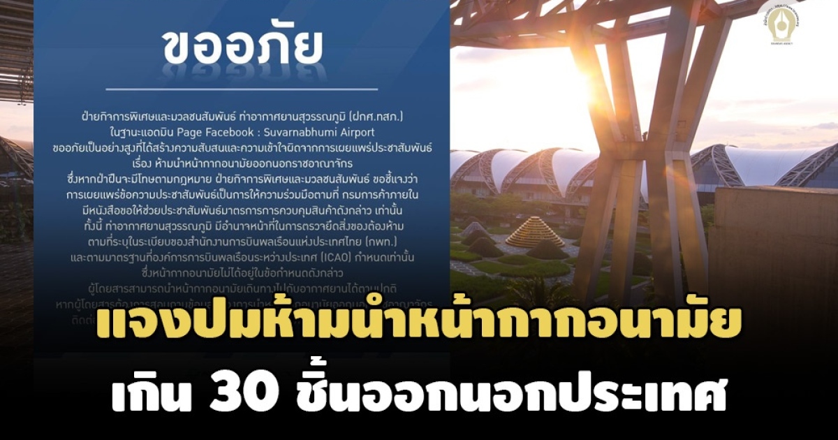 ผู้สื่อข่าวรายงานว่า เมื่อวันที่ 5 ก.พ. 2565 จากกรณี ท่าอากาศยานสุวรรณภูมิ บริษัท ท่าอากาศยานไทย จำกัด (มหาชน) หรือ AOT ได้เผยแพร่ข้อมูลเกี่ยวกับการพกพาหน้ากากอนามัยออกนอกราชอาณาจักร โดยระบุว่า ห้ามมิให้บุคคลใดส่งหน้ากากอนามัยออกไปนอกราชอาณาจักร เว้นแต่จะได้รับหนังสืออนุญาตจากเลขาธิการ แต่มิให้ใช้บังคับแก่กรณีนำติดตัวไปใช้นอกราชอาณาจักรเป็นการชั่วคราวไม่เกิน 30 ชิ้นต่อครั้ง หรือในกรณีมีใบรับรองแพทย์แสดงเหตุผลความจำเป็น ให้นำติดตัวได้ไม่เกิน 50 ชิ้นต่อครั้ง ฝ่าฝืน ระวางโทษจำคุกไม่เกิน 5 ปี หรือปรับไม่เกินหนึ่งแสนบาท หรือทั้งจำทั้งปรับ ผ่านเพจเฟซบุ๊ก Suvarnabhumi Airport ต่อมาได้ลบโพสต์ดังกล่าวแล้ว