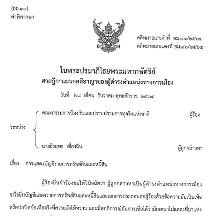 พิพากษาว่า นายธีรยุทธ เซี่ยงฉิน ผู้ถูกกล่าวหาจงใจยื่นบัญชีแสดงรายการทรัพย์สิน และหนี้สินและเอกสารประกอบต่อคณะกรรมการป้องกันและปราบปรามการทุจริตแห่งชาติด้วยข้อความอันเป็นเท็จหรือปกปิดข้อเท็จจริงที่ควรแจ้งให้ทราบ กรณีพ้นจากตําแหน่งรองนายกองค์การ บริหารส่วนตําบลทับใต้ อําเภอหัวหิน จังหวัดประจวบคีรีขันธ์ ตามพระราชบัญญัติประกอบ รัฐธรรมนูญว่าด้วยการป้องกันและปราบปรามการทุจริต พ.ศ. 2542 มาตรา 32 และมาตรา 33 ห้ามมิให้ผู้ถูกกล่าวหาดํารงตําแหน่งทางการเมืองหรือดํารงตําแหน่งใดในพรรคการเมืองเป็นเวลาห้าปี นับแต่วันที่ 3 พฤศจิกายน 2557 ซึ่งเป็นวันที่พ้นจากตําแหน่งตามพระราชบัญญัติประกอบ รัฐธรรมนูญว่าด้วยการป้องกันและปราบปรามการทุจริต พ.ศ. 2542 มาตรา 34 วรรคสอง กับมี ความผิดตามพระราชบัญญัติประกอบรัฐธรรมนูญว่าด้วยการป้องกันและปราบปรามการทุจริต พ.ศ. 2542 มาตรา 119 จําคุก 2 เดือน และปรับ 8,000 บาท ผู้ถูกกล่าวหาให้การรับสารภาพเป็นประโยชน์แก่การพิจารณา มีเหตุบรรเทาโทษ ลดโทษให้กึ่งหนึ่งตามประมวลกฎหมายอาญา มาตรา 78 คงจําคุก 1 เดือน และปรับ 4,000 บาท ไม่ปรากฏว่าผู้ถูกกล่าวหาเคยได้รับโทษจําคุกมาก่อน โทษจําคุกจึงให้รอการลงโทษไว้มีกําหนด 1 ปี ตามประมวลกฎหมายอาญา มาตรา 56 ไม่ชําระค่าปรับให้จัดการตามประมวลกฎหมายอาญา มาตรา 29, 30. (คดีหมายเลขแดงที่ อม.16/2564 วันที่ 28 ธ.ค.2564)
