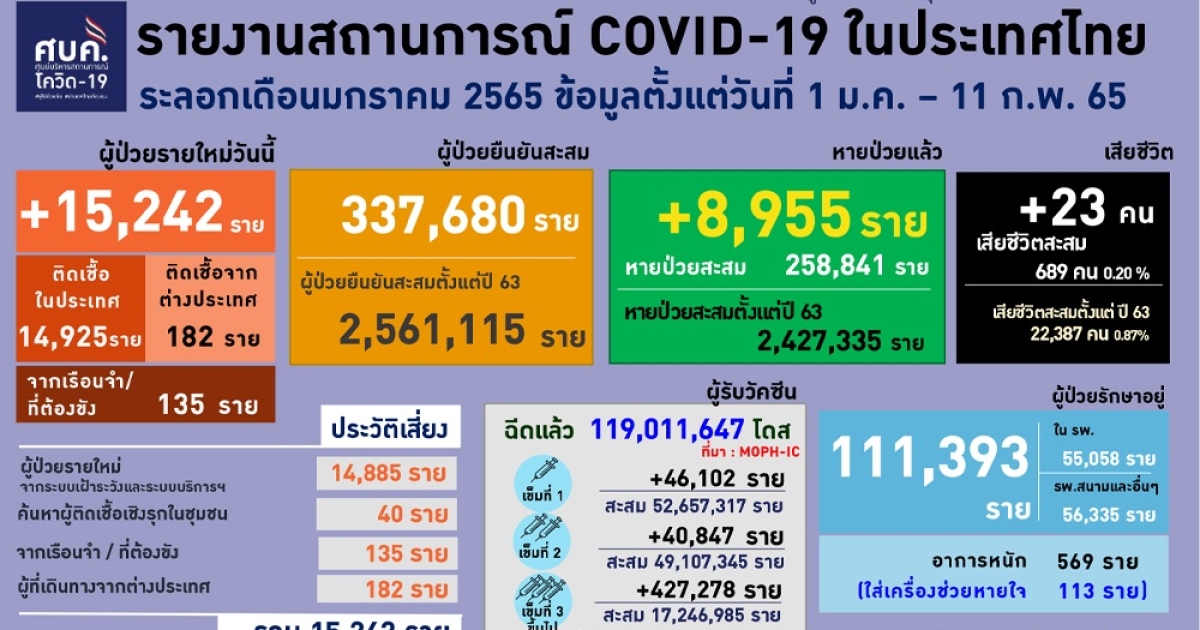 สำนักข่าวอิศรา (www.isranews.org) รายงานว่า เมื่อวันที่ 11 ก.พ.2565 นพ.ทวีศิลป์ วิษณุโยธิน โฆษกศูนย์บริหารสถานการณ์โควิด (ศบค.) รายงานสถานการณ์ประจำวัน โดยพบผู้ป่วยรายใหม่ 15,242 ราย จำแนกเป็น ติดเชื้อในประเทศ 14,925 ราย เกิดจากระบบเฝ้าระวังและระบบบริการฯ 14,885 ราย เกิดจากการค้นหาเชิงรุกและพบการติดเชื้อในชุมชน 40 ราย ติดเชื้อภายในเรือนจำ 135 ราย อีก 182 รายเดินทางกลับมาจากต่างประเทศ รวมผู้ป่วยสะสม 2,561,115 ราย
