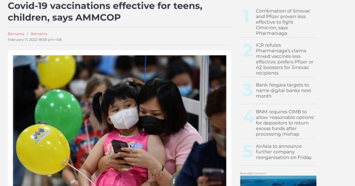 สำนักข่าวอิศรา (www.isranews.org) รายงานสถานการณ์เกี่ยวกับการระบาดของไวรัสโควิด-19 หรือโคโรน่าไวรัสว่าที่ประเทศมาเลเซียนั้นโดยวิทยาลัยกุมารเวชศาสตร์ สถาบันแพทยศาสตร์แห่งมาเลเซีย หรือ AMMCOP ได้ออกมาเปิดเผยว่าวัคซีนป้องกันไวรัสโควิด-19 นั้นมีความปลอดภัยกับเด็กและวัยรุ่น โดยการประกาศดังกล่าวมาจากผลการเก็บข้อมูลใน 100 ประเทศที่เริ่มฉีดวัคซีนให้กับเด็กนที่อายุ 12-17 ปีรวมไปถึงที่มาเลเซียนับตั้งแต่เดือน พ.ย. 2564
