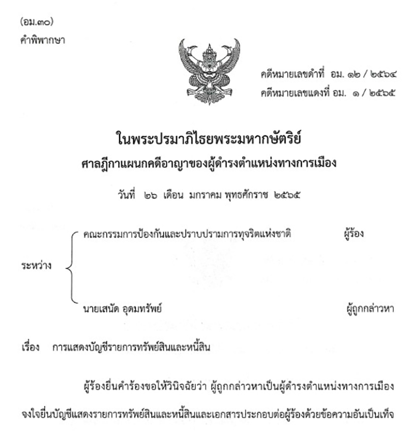 พิพากษาว่า นายเสนัด อุดมทรัพย์ ผู้ถูกกล่าวหา จงใจยื่นบัญชีแสดงรายการทรัพย์สินและหนี้สินและเอกสารประกอบต่อคณะกรรมการ ป.ป.ช. ด้วยข้อความอันเป็นเท็จหรือ ปกปิดข้อเท็จจริงที่ควรแจ้งให้ทราบกรณีพ้นจากตําแหน่งนายกเทศมนตรีตําบลเมืองบัว อําเภอเกษตรวิสัย จังหวัดร้อยเอ็ด ตามพระราชบัญญัติประกอบรัฐธรรมนูญว่าด้วยการป้องกันและ ปราบปรามการทุจริต พ.ศ. 2542 มาตรา 32 และมาตรา 33 ห้ามมิให้ผู้ถูกกล่าวหาดํารงตําแหน่งทางการเมืองหรือดํารงตําแหน่งใดในพรรคการเมืองเป็นเวลาห้าปีนับแต่วันที่ 2 พฤศจิกายน 2555 ซึ่งเป็นวันที่พ้นจากตําแหน่งตามพระราชบัญญัติประกอบรัฐธรรมนูญว่าด้วยการป้องกันและปราบปรามการทุจริต พ.ศ. 2542 มาตรา 34 วรรคสอง กับมีความผิดตามพระราชบัญญัติประกอบรัฐธรรมนูญว่าด้วยการป้องกันและปราบปรามการทุจริต พ.ศ. 2542 มาตรา 119 จําคุก 2 เดือน และปรับ 8,000 บาท ผู้ถูกกล่าวหาให้การรับสารภาพ เป็นประโยชน์แก่การพิจารณา มีเหตุบรรเทาโทษ ลดโทษให้กึ่งหนึ่งตามประมวลกฎหมายอาญา มาตรา 78 คงจําคุก 1 เดือน และ ปรับ 4,000 บาท ไม่ปรากฏว่าผู้ถูกกล่าวหาเคยได้รับโทษจําคุกมาก่อน โทษจําคุกจึงให้รอการลงโทษไว้มีกําหนด 1 ปี ตามประมวลกฎหมายอาญา มาตรา 56 ไม่ชําระค่าปรับให้จัดการ ตามประมวลกฎหมายอาญา มาตรา 29 , 30 คําขออื่นนอกจากนี้ให้ยก (คดีหมายเลขแดงที่ อม.1 /2565 วันที่ 26 มกราคม 2565)