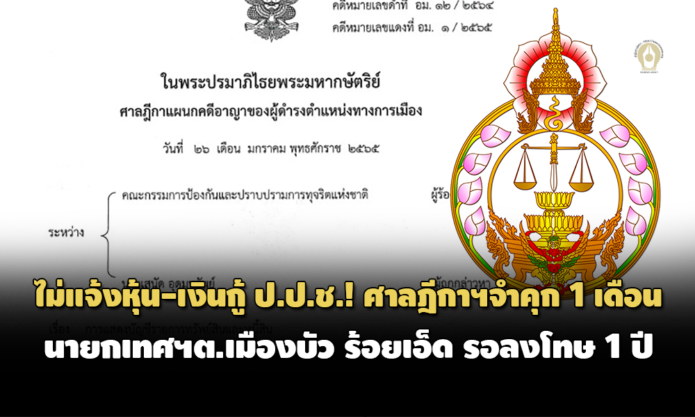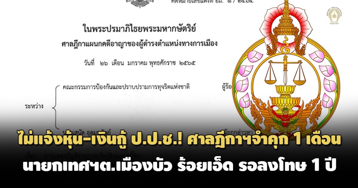 ซุกทรัพย์สิน ป.ป.ช.! ศาลฎีกาฯคุก 1 เดือน นายกเทศฯ จ.มุกดาหาร รอลงโทษ 1 ปี