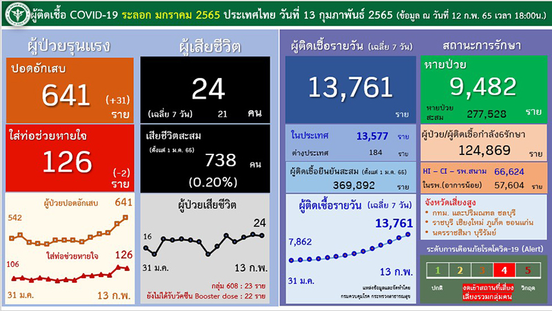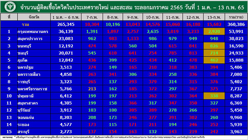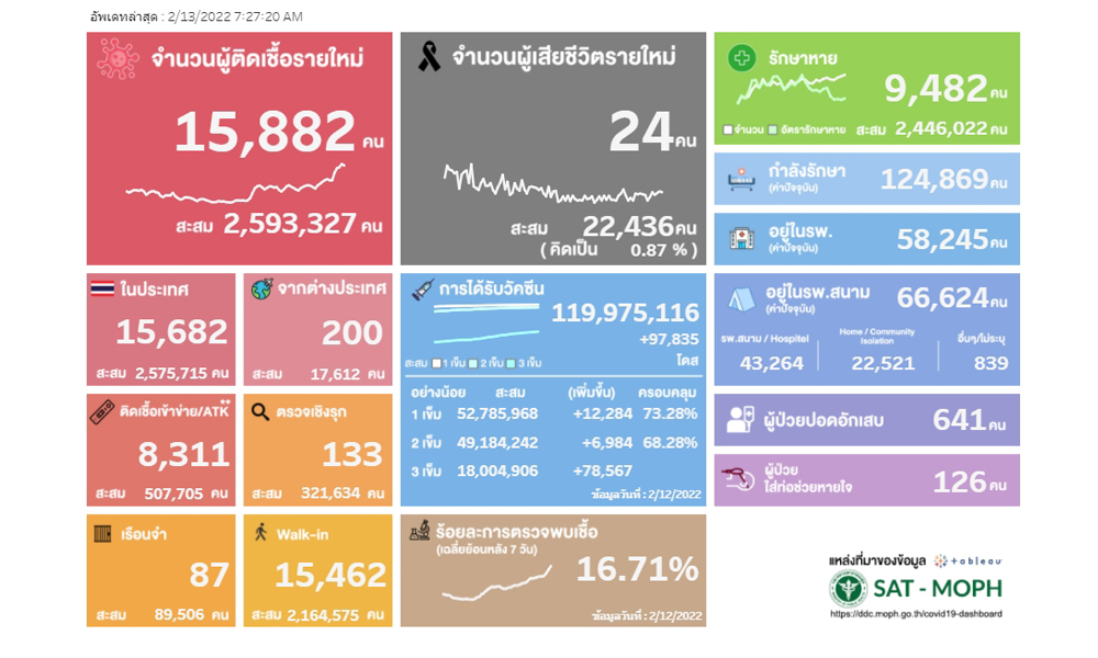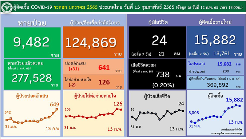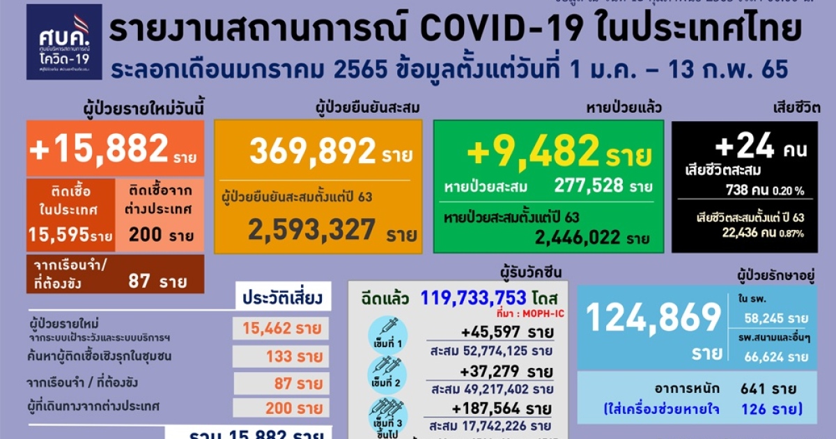 สำนักข่าวอิศรา (www.isranews.org) รายงานว่า เมื่อวันที่ 13 ก.พ. 2565 ศูนย์บริหารสถานการณ์โควิด (ศบค.) รายงานสถานการณ์ประจำวัน โดยพบผู้ป่วยรายใหม่ 15,882 ราย จำแนกเป็น ติดเชื้อในประเทศ 15,595 ราย เกิดจากระบบเฝ้าระวังและระบบบริการฯ 15,462 ราย เกิดจากการค้นหาเชิงรุกและพบการติดเชื้อในชุมชน 133 ราย ติดเชื้อภายในเรือนจำ 87 ราย อีก 200 รายเดินทางกลับมาจากต่างประเทศ รวมผู้ป่วยสะสม 2,597,327 ราย