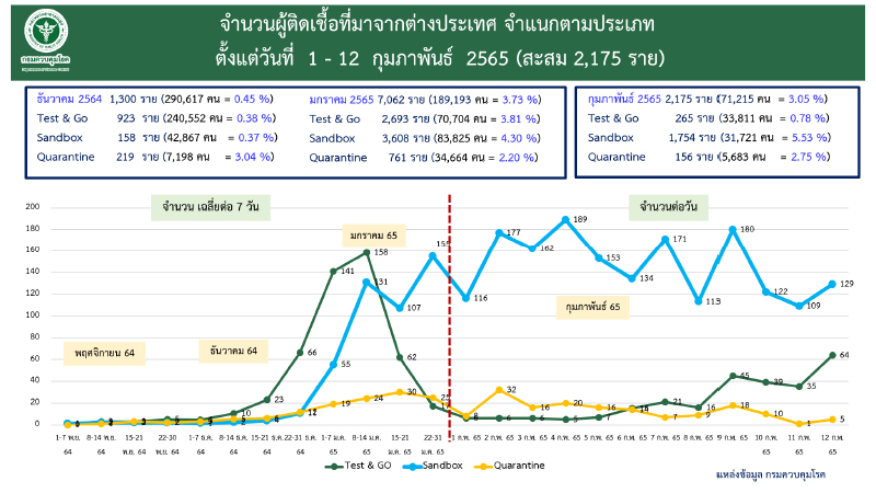 ทำให้ผู้ติดเชื้อจากต่างประเทศ เดือน ก.พ. สะสมรวม 2,175 ราย จำแนกเป็น แบบไม่ต้องกักตัว (Test and Go) 265 ราย แบบแซนด์บ็อกซ์ (Sandbox) 1,754 ราย แบบกักตัว (Quarantine) 156 ราย ทั้งหมดนี้คิดเป็นอัตราการติดเชื้อ 3.05%