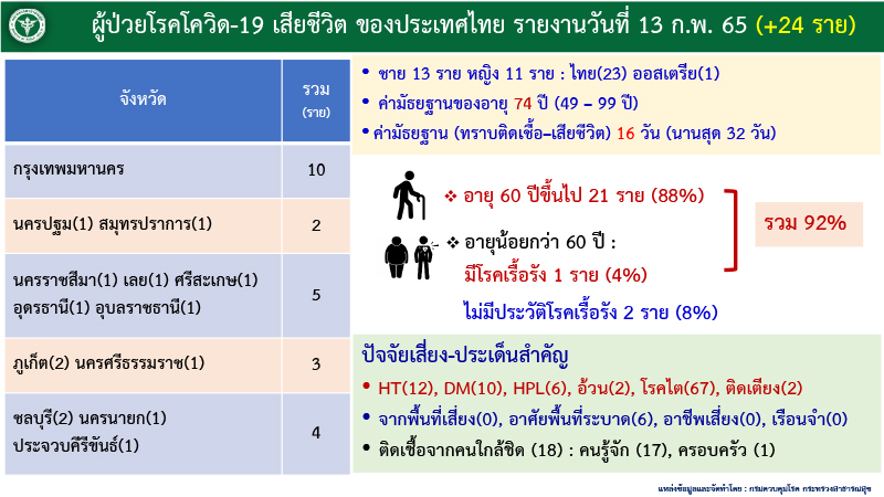 สำหรับผู้เสียชีวิต 24 ราย โดยในจำนวนนี้ มาจาก กทม. 10 ราย นครปฐม 1 ราย สมุทรปราการ 1 ราย นครราชสีมา 1 ราย เลย 1 ราย ศรีสะเกษ 1 ราย อุดรธานี 1 ราย อุบลราชธานี 1 ราย ภูเก็ต 2 ราย นครศรีธรรมราช 1 ราย ชลบุรี 2 ราย นครนายก 1 ราย ประจวบคีรีขันธ์ 1 ราย มีปัจจัยเสี่ยงมาจากโรคประจำตัว การอาศัยในพื้นที่ระบาด และการติดเชื้อจากคนใกล้ชิด