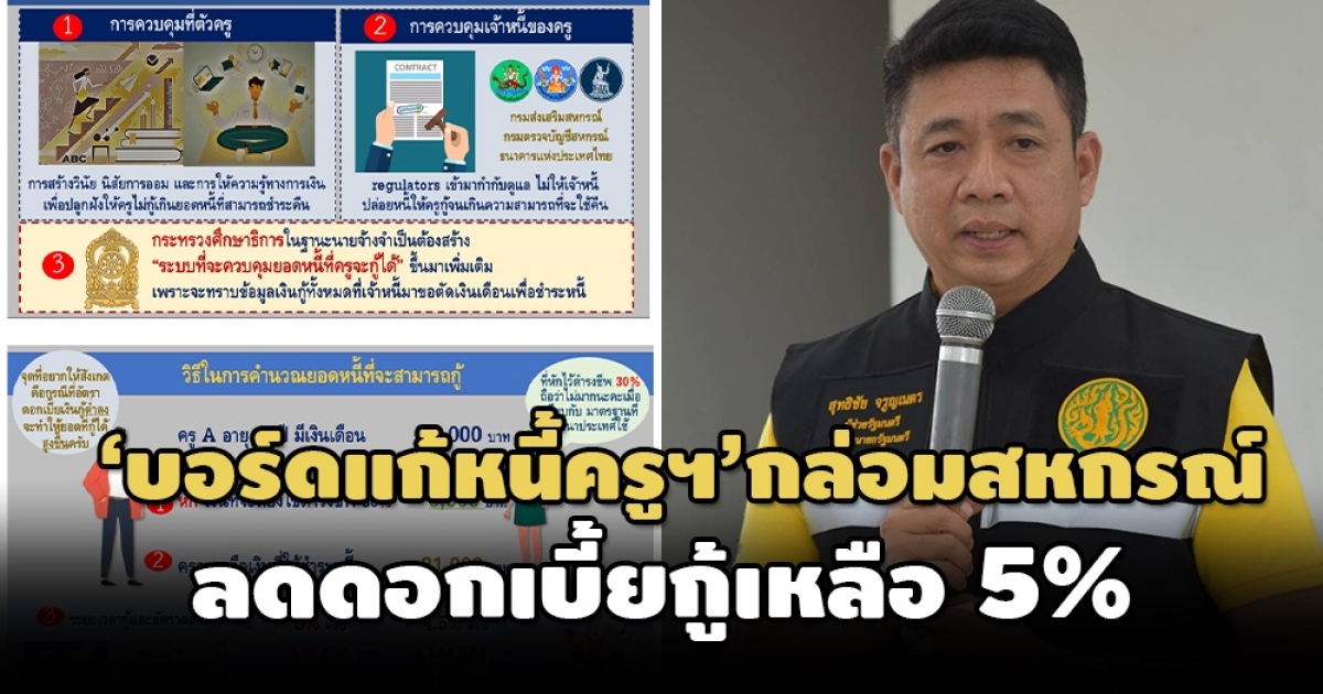 ‘บอร์ดแก้ปัญหาหนี้สินครู’ เร่งแก้ปัญหาหนี้ครู 1.4 ล้านล้านบาท เผยกล่อมสหกรณ์ครู 70 แห่งลดดอกเบี้ย 0.25-1% ลดภาระกว่า 1.7 พันล้าน จับมือ ‘ออมสิน’ รีไฟแนนซ์หนี้ครู ช่วยลดดอกเบี้ย เดินหน้าคุมเพดานก่อหนี้ ลดค่าธรรมเนียมต่างๆ รวมถึงการ ‘ค้ำประกันด้วยบุคคล’ ระบเป็นการสร้างภาระโดยไม่จำเป็น