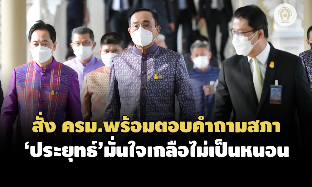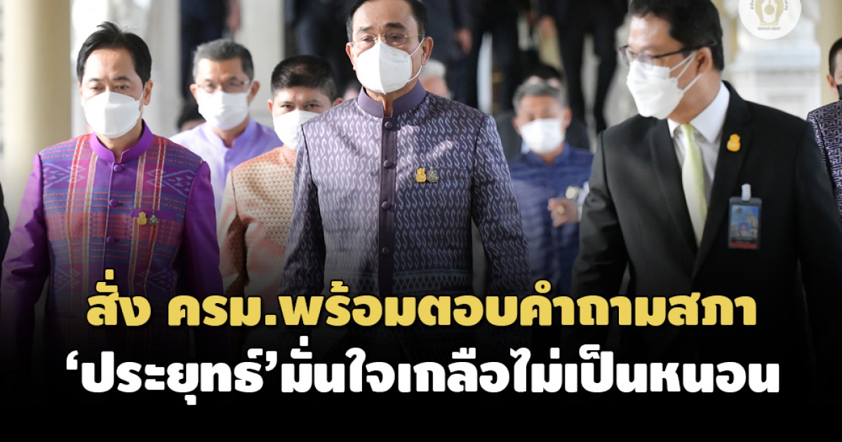 ‘ประยุทธ์’ สั่ง ครม.เตรียมพร้อมตอบคำถามสภา ย้ำจะพูดเปิดเองทุกประเด็น ก่อนมอบรัฐมนตรีชี้แจง เมินศึกอภิปรายไม่ไว้วางใจช่วง พ.ค.65 ถามกลับอะไรสำคัญกว่ากัน ระหว่างประเทศชาติ ประชาชน และการเอาชนะกันทางการเมือง