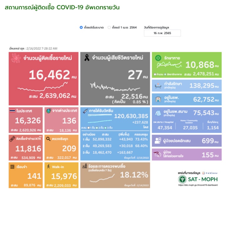 สำนักข่าวอิศรา (www.isranews.org) รายงานว่า เมื่อวันที่ 16 ก.พ. 2565 ศูนย์บริหารสถานการณ์โควิด (ศบค.) รายงานสถานการณ์ประจำวัน โดยพบผู้ป่วยรายใหม่ 16,462 ราย จำแนกเป็น ติดเชื้อในประเทศ 16,185 ราย เกิดจากระบบเฝ้าระวังและระบบบริการฯ 15,976 ราย เกิดจากการค้นหาเชิงรุกและพบการติดเชื้อในชุมชน 209 ราย ติดเชื้อภายในเรือนจำ 141 ราย อีก 136 รายเดินทางกลับมาจากต่างประเทศ รวมผู้ป่วยสะสม 2,639,062 ราย
