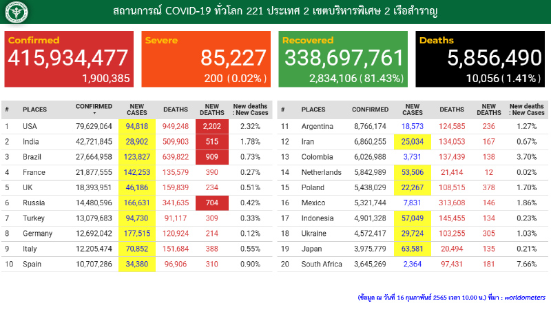 ขณะที่สถานการณ์ทั่วโลกพบผู้ป่วยเพิ่ม 1,900,385 ราย รวม 415,934,477 ราย อาการหนัก 85,227 ราย หายป่วย 338,697,761 ราย เสียชีวิต 5,856,490 ราย โดยสหรัฐอเมริกาพบผู้ป่วยเพิ่ม 94,818 ราย รวม 79,629,064 ราย เสียชีวิตเพิ่ม 2,202 ราย รวม 949,248 ราย อินเดีย พบเพิ่ม 28,902 ราย รวม 42,721,845 ราย เสียชีวิตเพิ่ม 515 ราย รวม 509,903 ราย บราซิล พบเพิ่ม 123,827 ราย รวม 27,664,958 ราย เสียชีวิตเพิ่ม 909 ราย รวม 638,822 ราย ส่วนไทยอยู่ในอันดับที่ 31 ของโลก