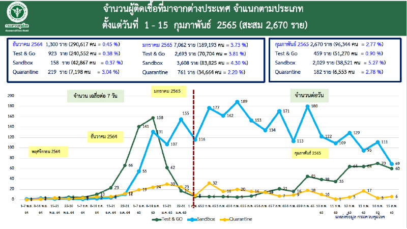 ทำให้ผู้ติดเชื้อจากต่างประเทศ เดือน ก.พ. สะสมรวม 2,670 ราย จำแนกเป็น แบบไม่ต้องกักตัว (Test and Go) 459 ราย แบบแซนด์บ็อกซ์ (Sandbox) 2,029 ราย และแบบกักตัว (Quarantine) 182 ราย ทั้งหมดนี้คิดเป็นอัตราการติดเชื้อ 2.77%