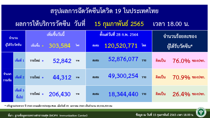 ขณะที่ การกระจายวัคซีนในประเทศ พบผู้ที่ได้รับผู้ที่ได้รับวัคซีนเข็มที่ 1 เพิ่มเติม จำนวน 52,842 ราย ผู้ได้รับเข็มที่ 2 จำนวน 44,312 ราย และผู้ได้รับเข็มที่ 3 จำนวน 206,430 ราย รวมสะสมผู้ได้รับวัคซีนแล้ว 120,520,771 ราย แบ่งเป็น ผู้ได้รับเข็มที่ 1 จำนวน 52,876,077 ราย คิดเป็น 76% ผู้ได้รับเข็มที่ 2 จำนวน 49,300,254 ราย คิดเป็น 70.9% และผู้ได้รับเข็มที่ 3 จำนวน 18,344,440 ราย คิดเป็น 26.4%