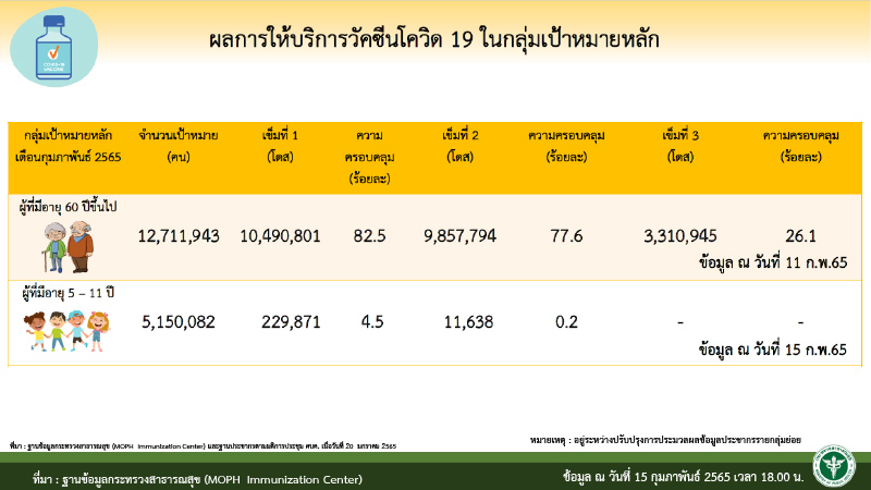 โดยมีผลการให้บริการวัคซีนโควิดกลุ่มเป้าหมายหลัก คือ กลุ่มผู้มีอายุมากกว่า 60 ปีขึ้นไป จากเป้าหมาย 12,711,943 ราย ฉีดวัคซีนเข็มแรกแล้ว 10,490,801 ราย คิดเป็น 82.5% เข็มที่สอง 9,857,794 ราย คิดเป็น 77.6% เข็มที่สาม 3,310,945 ราย คิดเป็น 26.1% และกลุ่มเด็กอายุ 5-11 ปี จากเป้าหมาย 5,150,082 ราย ฉีดวัคซีนเข็มแรกแล้ว 229,871 ราย คิดเป็น 4.5% เข็มที่สอง 11,638 ราย คิดเป็น 0.2%