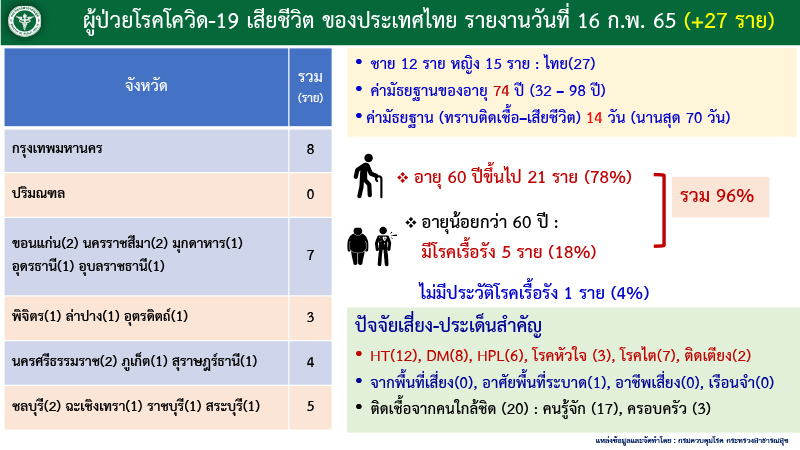สำหรับผู้เสียชีวิต 27 ราย โดยในจำนวนนี้ มาจาก กทม. 8 ราย ขอนแก่น 2 ราย นครราชสีมา 2 ราย มุกดาหาร 1 ราย อุดรธานี 1 ราย อุบลราชธานี 1 ราย พิจิตร 1 ราย ลำปาง 1 ราย อุตรดิตถ์ 1 ราย นครศรีธรรมราช 2 ราย ภูเก็ต 1 ราย สุราษฎร์ธานี 1 ราย ชลบุรี 2 ราย ฉะเชิงเทรา 1 ราย ราชบุรี 1 ราย และสระบุรี 1 ราย มีปัจจัยเสี่ยงมาจากโรคประจำตัว การอาศัยในพื้นที่ระบาด และการติดเชื้อจากคนใกล้ชิด