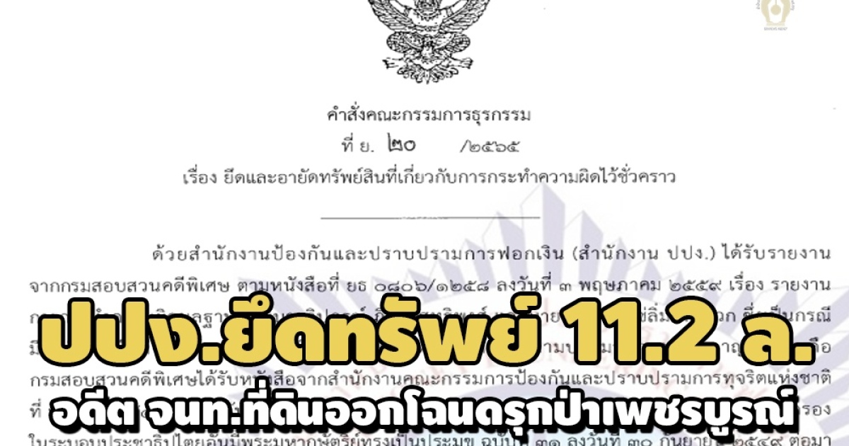 ปปง.ยึดอายัดทรัพย์ ที่ดิน 19 แปลง เงินฝาก 6 บัญชี 1 สลากออมสิน รวม 26 รายการ มูลค่า 11.2 ล. จนท.ที่ดิน กับพวก คดีปฏิบัติหน้าที่มิชอบกรณีออกโฉนดที่ดินทับซ้อนพื้นที่ ป่าภูเปือย ป่าภูขี้เถ้า ป่าภูเรือ อ.หล่มเก่า จ.เพชรบูรณ์ หลังดีเอสไอชงเรื่องปี 2559 รับไม้จาก ป.ป.ช.