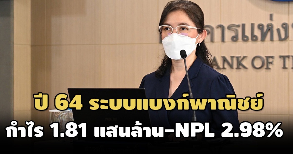 ‘ธปท.’ เผยปี 64 ธนาคารพาณิชย์ทั้งระบบมีกำไรสุทธิ 1.81 แสนล้านบาท เพิ่มขึ้น 23.6% จากปีก่อน ขณะที่ ‘หนี้เสีย’ ลดลงมาอยู่ที่ 2.98% ต่อสินเชื่อรวม