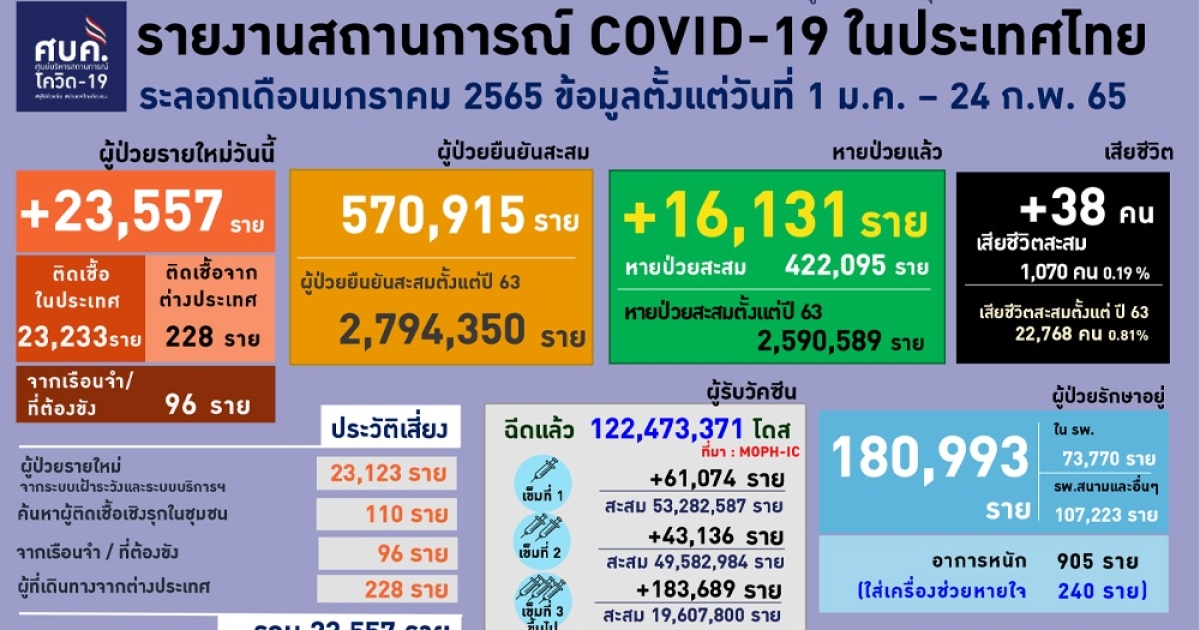 สำนักข่าวอิศรา (www.isranews.org) รายงานว่า เมื่อวันที่ 24 ก.พ. 2565 ศูนย์บริหารสถานการณ์โควิด (ศบค.) รายงานสถานการณ์ประจำวัน โดยพบผู้ป่วยรายใหม่ 23,557 ราย จำแนกเป็น ติดเชื้อในประเทศ 23,233 ราย เกิดจากระบบเฝ้าระวังและระบบบริการฯ 23,123 ราย เกิดจากการค้นหาเชิงรุกและพบการติดเชื้อในชุมชน 110 ราย ติดเชื้อภายในเรือนจำ 96 ราย อีก 228 รายเดินทางกลับมาจากต่างประเทศ รวมผู้ป่วยสะสม 2,794,350 ราย