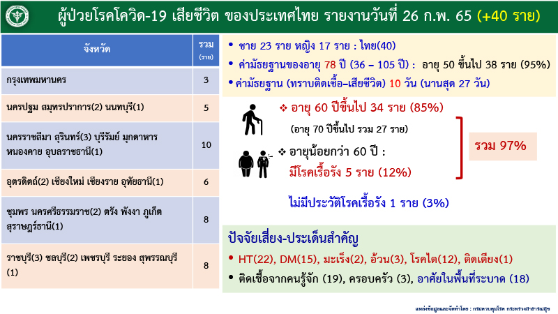สำหรับผู้เสียชีวิต 40 ราย เป็นผู้สูงอายุ 34 ราย กลุ่มโรคเรื้อรัง 5 รายคิดเป็น 97% และมี 1 ราย ไม่มีประวัติโรคเรื้อรัง ในจำนวนนี้ มาจาก กทม. 3 ราย นครปฐม 2 ราย สมุทรปราการ 2 ราย นนทบุรี 1 ราย นครราชสีมา 3 ราย สุรินทร์ 3 ราย บุรีรัมย์ 1 ราย มุกดาหาร 1 ราย หนองคาย 1 ราย อุบลราชธานี 1 ราย อุตรดิตถ์ 2 ราย เชียงใหม่ 1 ราย เชียงราย 1 ราย อุทัยธานี 1 ราย ชุมพร 2 ราย นครศรีธรรมราช 2 ราย ตรัง 1 ราย พังงา 1 ราย ภูเก็ต 1 ราย สุราษฎร์ธานี 1 ราย