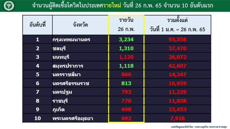 โดย 10 จังหวัดที่มีผู้ติดเชื้อโควิดรายใหม่สูงสุด ตามลำดับ ได้แก่ กทม. 3,234 ราย ชลบุรี 1,310 ราย นนทบุรี 1,129 ราย สมุทรปราการ 1,118 ราย นครราชสีมา 866 ราย นครศรีธรรมราช 813 ราย นครปฐม 793 ราย ราชบุรี 770 ราย ภูเก็ต 698 ราย พระนครศรีอยุธยา 692 ราย