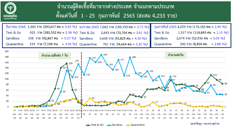 ทำให้ผู้ติดเชื้อจากต่างประเทศ เดือน ก.พ. สะสมรวม 4,233 ราย จำแนกเป็น แบบไม่ต้องกักตัว (Test and Go) 1,317 ราย แบบแซนด์บ็อกซ์ (Sandbox) 2,674 ราย แบบกักตัว (Quarantine) 242 ราย