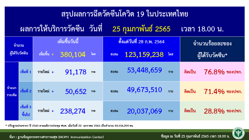 ขณะที่ การกระจายวัคซีนในประเทศ พบผู้ที่ได้รับผู้ที่ได้รับวัคซีนเข็มที่ 1 เพิ่มเติม จำนวน 91,178 ราย ผู้ได้รับเข็มที่ 2 จำนวน 50,652 ราย และผู้ได้รับเข็มที่ 3 ขึ้นไป จำนวน 238,274 ราย รวมสะสมผู้ได้รับวัคซีนแล้ว 123,159,238 ราย แบ่งเป็น ผู้ได้รับเข็มที่ 1 จำนวน 53,448,238 ราย คิดเป็น 76.8% ผู้ได้รับเข็มที่ 2 จำนวน 49,673,510 ราย คิดเป็น 71.4% และผู้ได้รับเข็มที่ 3 จำนวน 20,037,069 ราย คิดเป็น 28.8%