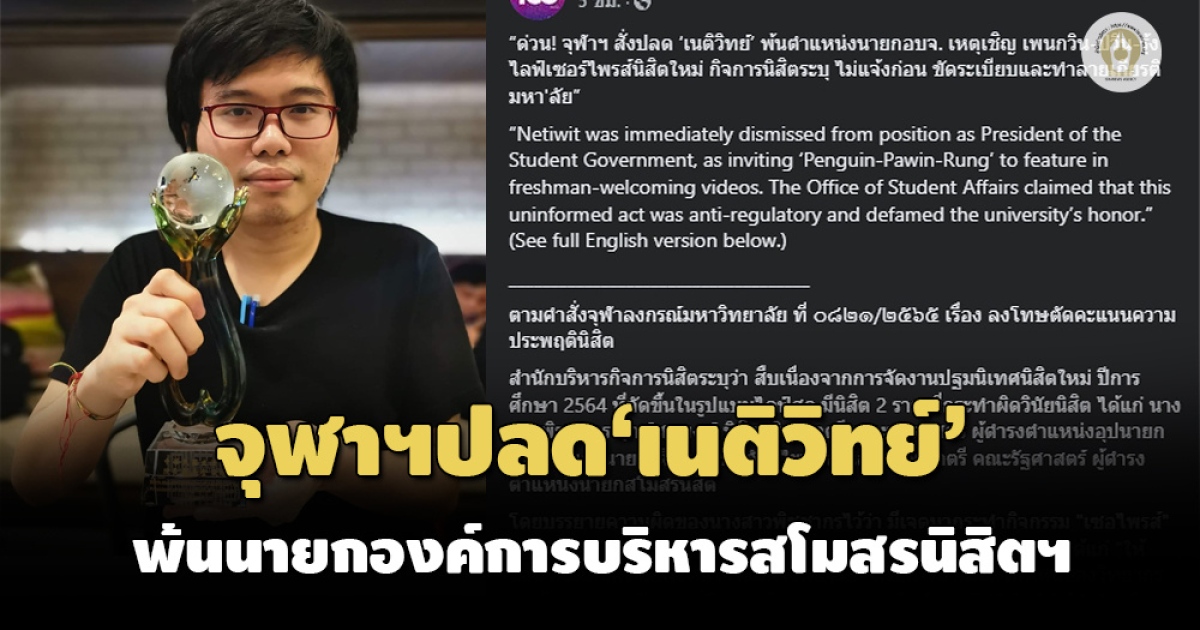ผู้สื่อข่าวรายงานว่า เมื่อวันที่ 26 ก.พ.2565 องค์การบริหารสโมสรนิสิตจุฬาลงกรณ์มหาวิทยาลัย (อบจ.) โพสต์ข้อความผ่านเฟซบุ๊ก ระบุข้อความว่า “ด่วน! จุฬาฯ สั่งปลด ‘เนติวิทย์’ พ้นตำแหน่งนายก อบจ. เหตุเชิญ เพนกวิน-ปวิน-รุ้ง ไลฟ์เซอร์ไพรส์นิสิตใหม่ กิจการนิสิตระบุ ไม่แจ้งก่อน ขัดระเบียบและทำลายเกียรติมหาวิทยาลัย”